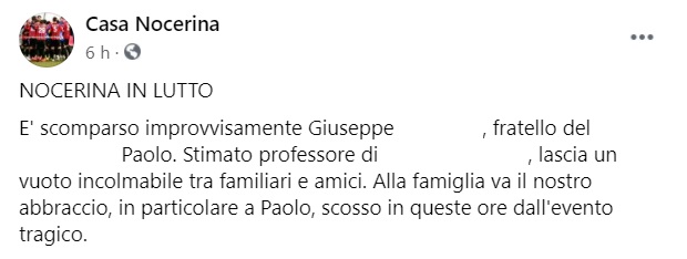 "NOCERINA IN LUTTO. E' scomparso improvvisamente Giuseppe ... , fratello del ... Paolo. -Si legge nella nota- Stimato professore di ... , lascia un vuoto incolmabile tra familiari e amici. Alla famiglia va il nostro abbraccio, in particolare a Paolo, scosso in queste ore dall'evento tragico."