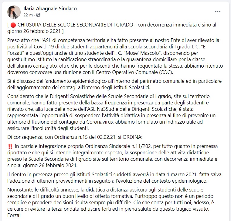 Questo quanto pubblicato sulla pagina facebook del Sindaco di Sant'Antonio Abate: "CHIUSURA DELLE SCUOLE SECONDARIE DI I GRADO - con decorrenza immediata e sino al giorno 26 febbraio 2021 Preso atto che l'ASL di competenza territoriale ha fatto presente al nostro Ente di aver rilevato la positivita' al Covid-19 di due studenti appartenenti alla scuola secondaria di I grado I. C. "E. Forzati" e - si legge nella nota - quest’oggi anche di uno studente dell'I. C. "Mose' Mascolo", disponendo per quest'ultimo Istituto la sanificazione straordinaria e la quarantena domiciliare per la classe dell'alunno contagiato, oltre che per le docenti che hanno frequentato la stessa, abbiamo ritenuto doveroso convocare una riunione con il Centro Operativo Comunale (COC). Si è discusso dell’andamento epidemiologico all’interno del perimetro comunale ed in particolare dell’aggiornamento dei contagi all’interno degli Istituti Scolastici. Considerato che le Dirigenti Scolastiche delle Scuole Secondarie di I grado, site sul territorio comunale, hanno fatto presente della bassa frequenza in presenza da parte degli studenti - si legge nella nota - e rilevato che, alla luce delle note dell'ASL Na3Sud e delle Dirigenti Scolastiche, è stata rappresentata l’opportunità di sospendere l’attività didattica in presenza al fine di prevenire un ulteriore diffusione del contagio da Coronavirus, abbiamo formulato un indirizzo utile ad assicurare l'incolumità degli studenti. Di conseguenza, con Ordinanza n.15 del 02.02.21, si ORDINA: In parziale integrazione propria Ordinanza Sindacale n.11/202, per tutto quanto in premessa riportato e che qui si intende integralmente esposto, la sospensione delle attività didattiche presso le Scuole Secondarie di I grado site sul territorio comunale, con decorrenza immediata e sino al giorno 26 febbraio 2021. Il rientro in presenza presso gli Istituti Scolastici suddetti avverrà in data 1 marzo 2021, fatta salva l’adozione di ulteriori provvedimenti in seguito all’evoluzione del contesto epidemiologico. Nonostante le difficoltà annesse - si legge nella nota -, la didattica a distanza assicura agli studenti delle scuole secondarie di I grado un buon livello di offerta formativa. Purtroppo questo non è un periodo semplice e prendere decisioni risulta sempre più difficile. Ciò che conta per tutti noi, adesso, è cercare di evitare la terza ondata ed uscire forti ed in piena salute da questo tragico vissuto. Forza!".