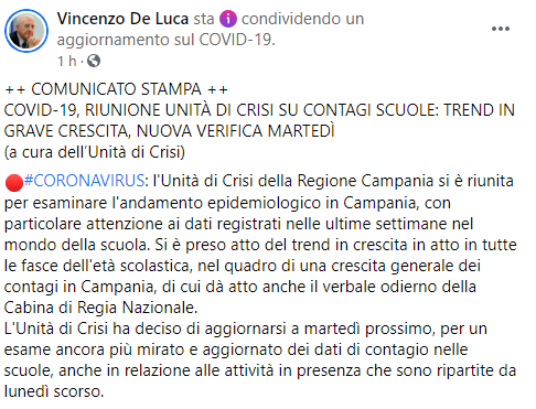 Dalla pagina Facebook del Governatore della Regione Campania Vincenzo De Luca: "Comunicato stampa. Covid-19, riunione Unità di Crisi su contagi scuole: trend in grave crescita. Nuova verifica martedì (a cura dell'Unità di Crisi). Coronavirus: l'Unità di Crisi della Regione Campania - si legge nel post - si è riunita per esaminare l'andamento epidemiologico in Campania, con particolare attenzione ai dati registrati nelle ultime settimane nel mondo della scuola. Si è preso atto - continua la nota - del trend in crescita in atto in tutte le fasce dell'età scolastica, nel quadro di una crescita generale dei contagi in Campania, di cui dà atto anche il verbale odierno della Cabina di Regia Nazionale. L'Unità di Crisi ha deciso di aggiornarsi a martedì prossimo - conclude la nota - per un esame ancora più mirato e aggiornato dei dati di contagio nelle scuole, anche in relazione alle attività in presenza che sono ripartite da lunedì scorso".