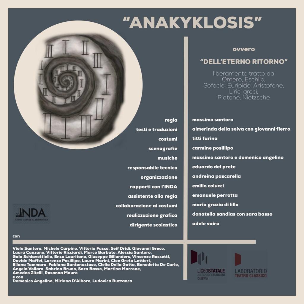 Dieci anni di storie e di giovani che continuano ad incantarsi alle storie dei Greci, perché… “ Voi Greci, siete sempre bambini e non avete alcun insegnamento che sia canuto per l'età”. Così, infatti, recita una delle battute di “ANAKYKLOSIS , ovvero dell’Eterno Ritorno”, l’opera in cui i giovanissimi interpreti, studenti dal primo al quinto anno liceale, si cimenteranno con codici espressivi diversi: dall’epico al tragico, - si legge nel comunicato- dal comico al lirico. Una grande contaminazione che investe lo spettatore attraverso lingue, costumi, suoni e stranianti associazioni temporali: tutto volto a dimostrare l’attualità di un messaggio e di una Parola, quella dei Greci, che di “antico” ha solo la convenzione linguistica appartenente al significante, mentre si staglia ancora di più in una semantica poderosa ed – si legge nel comunicato- inequivocabilmente fuori dal tempo per diventare un consiglio dettato al cuore di chi lo com-prende.