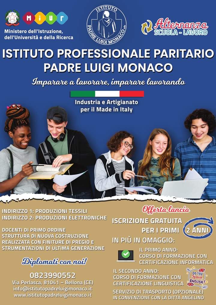 "L’Istituto Professionale Paritario “Padre Luigi Monaco” apre le porte agli studenti con l’apertura delle iscrizioni per l’anno scolastico 2019/2020! L’Istituto può contare su una struttura nuova e all’avanguardia dove avranno luogo le lezioni dei due corsi presenti: produzioni tessili sartoriali e produzioni elettroniche. Si legge nel comunicato. Gli studenti saranno guidati da docenti competenti ad appassionati nel percorso che porterà loro all’acquisizione di un diploma largamente spendibile nel mondo del lavoro. Il motto dell’istituto è “Imparare a lavorare, imparare lavorando” e ciò si concretizzerà in lezioni di laboratorio, - si legge nel comunicato - stage e tirocini, il tutto accompagnato da vari servizi accessori quali la possibilità di usufruire di mezzi di trasporto scolastico privato, la possibilità di acquisizione di certificazioni linguistiche ed informatiche (gratuite per gli iscritti al primo e al secondo anno) e tanti altri servizi da scoprire in sede.