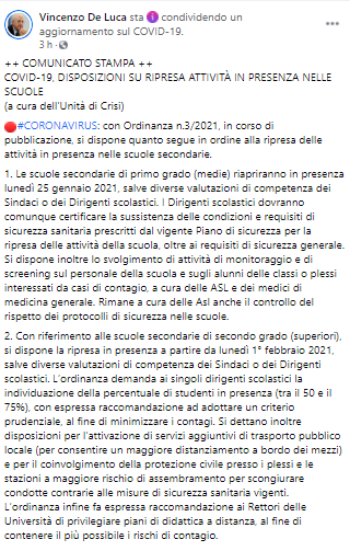 Questo il comunicato stampa diffuso dalla Regione Campania, anche attraverso la pagina Facebook del Governatore Vincenzo De Luca: "COVID-19, DISPOSIZIONI SU RIPRESA ATTIVITÀ IN PRESENZA NELLE SCUOLE (a cura dell’Unità di Crisi). Con Ordinanza n.3/2021 - s legge nella nota - in corso di pubblicazione, si dispone quanto segue in ordine alla ripresa delle attività in presenza nelle scuole secondarie. 1. Le scuole secondarie di primo grado (medie) riapriranno in presenza lunedì 25 gennaio 2021, salve diverse valutazioni di competenza dei Sindaci o dei Dirigenti scolastici. I Dirigenti scolastici - prosegue il comunicato - dovranno comunque certificare la sussistenza delle condizioni e requisiti di sicurezza sanitaria prescritti dal vigente Piano di sicurezza per la ripresa delle attività della scuola, oltre ai requisiti di sicurezza generale. Si dispone inoltre - si legge nella nota - lo svolgimento di attività di monitoraggio e di screening sul personale della scuola e sugli alunni delle classi o plessi interessati da casi di contagio, a cura delle ASL e dei medici di medicina generale. Rimane a cura delle Asl anche il controllo del rispetto dei protocolli di sicurezza nelle scuole. 2. Con riferimento alle scuole secondarie di secondo grado (superiori) - continua il comunicato - si dispone la ripresa in presenza a partire da lunedì 1° febbraio 2021, salve diverse valutazioni di competenza dei Sindaci o dei Dirigenti scolastici. L’ordinanza demanda ai singoli dirigenti scolastici la individuazione della percentuale di studenti in presenza (tra il 50 e il 75%), con espressa raccomandazione ad adottare un criterio prudenziale, al fine di minimizzare i contagi. Si dettano inoltre - prosegue la nota - disposizioni per l’attivazione di servizi aggiuntivi di trasporto pubblico locale (per consentire un maggiore distanziamento a bordo dei mezzi) e per il coinvolgimento della protezione civile presso i plessi e le stazioni a maggiore rischio di assembramento per scongiurare condotte contrarie alle misure di sicurezza sanitaria vigenti. L’ordinanza infine fa espressa raccomandazione ai Rettori delle Università di privilegiare piani di didattica a distanza - conclude la nota - al fine di contenere il più possibile i rischi di contagio". L'ordinanza è stata pubblicata intorno alle 22 ed è disponibile anche sulle pagine social della Regione Campania e del Governatore Vincenzo De Luca.