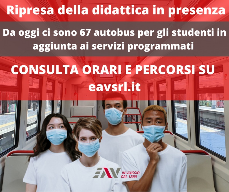 Questo quanto pubblicato sul sito dell'EAV in merito al trasporto aggiunto per la ripresa della didattica in presenza degli studenti: "Corse aggiuntive per accompagnamento studenti Da lunedì primo Febbraio parte il Piano predisposto da Eav dedicato agli studenti in occasione della riapertura in presenza degli istituti superiori - si legge nella nota -. A seguito dell’analisi dei dati inviati dagli istituti scolastici, EAV ha provveduto ad integrare i propri servizi con l’impiego di autobus aggiuntivi, rivolti prevalentemente a soddisfare la platea scolastica della scuola secondaria, per la quale è prevista la didattica in presenza del 50% - si legge nella nota - degli studenti a partire dal 1° febbraio. Il Piano operativo predisposto ha come obiettivo la riduzione del rischio di affollamento sulle tratte ferroviarie storicamente interessate dalla mobilità verso gli Istituti scolastici e diminuire il transito di viaggiatori nelle stazioni principali. Per il Piano saranno impegnati 67 autobus, di EAV e di Aziende NCC - si legge nella nota -, a supporto delle tratte ferroviarie maggiormente interessate e verso i punti dove si concentra il maggior numero di scuole. Questo anche tenendo nel dovuto conto alcune informazioni provenienti dagli istituti stessi. Stante la non omogeneità degli orari effettivi di ingresso ed uscita anche per gli istituti che insistono su una stessa tratta o sullo stesso comune, al fine di non disorientare il pubblico, si è provveduto ad uniformare gli orari - si legge nella nota -, al fine di consentire l’arrivo degli studenti tra le 7:45 e le 7:50, così come per gli ingressi delle 10.00. Analogamente, in uscita da scuola, le corse aggiuntive sono state previste tutte intorno alle 13:15 e 15:15. Di seguito le tabelle con i percorsi e gli orari". QUI I DETTAGLI