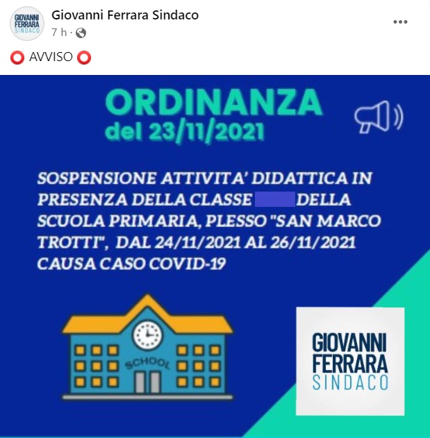 Questo quanto apprendiamo dalla pagina fb del Sindaco Ferrara di S.Felice a C: "AVVISO ORDINANZA del 23/11/2021. Sospensione attività didattica in presenza della classe ... della scuola primaria, plesso "San Marco Trotti", dal 24/11/2021 al 26/11/2021 causa caso Covid-19".