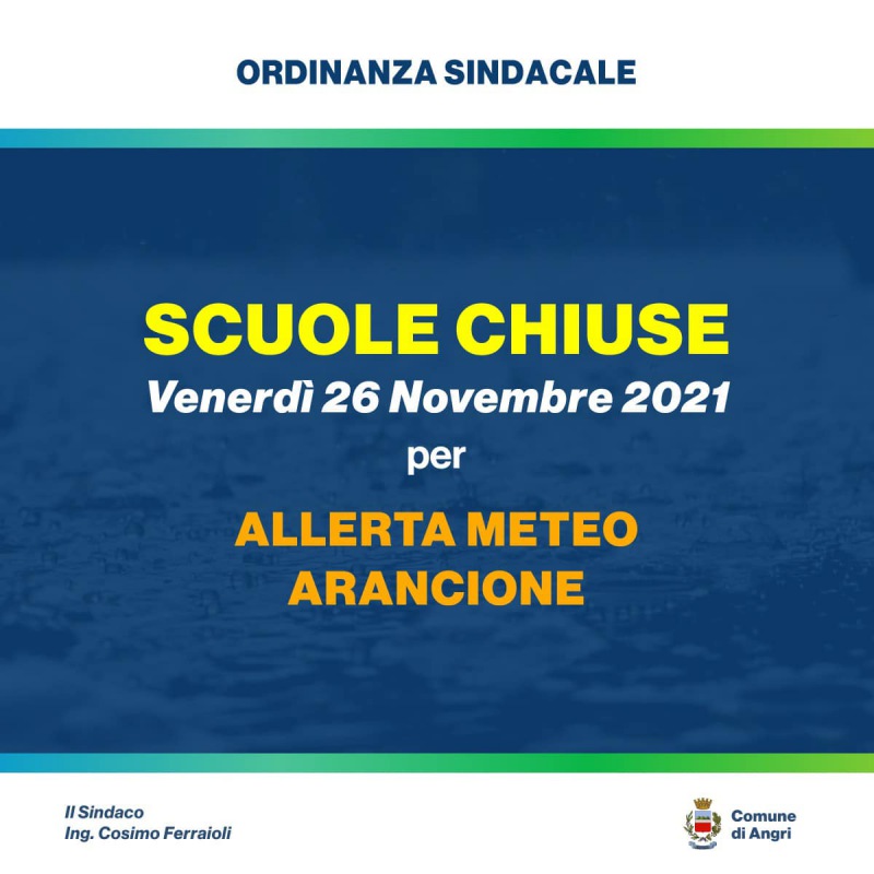 Questo quanto apprendiamo dalla pagina fb del Sindaco di Angri Ferraioli: "CHIUSURA SCUOLE PER ALLERTA ARANCIONE La Protezione Civile della Regione Campania ha emanato un avviso di allerta meteo con criticità idrogeologica di livello Arancione, valevole a partire dalle 18 di oggi fino alle 18 di domani Venerdì 26 Novembre. Al fine di garantire la pubblica incolumità di tutti i cittadini - si legge nella nota - e dei nostri ragazzi, ho firmato un’ordinanza in via precauzionale per la chiusura delle scuole di ogni ordine e grado per la giornata di Venerdì 26 Novembre. IMPORTANTE: Chiusa anche la villa comunale e il cimitero Si invita, inoltre, la cittadinanza a non sostare vicino ad edifici pericolanti ed alberi e all'uso degli autoveicoli solo in caso di necessità."