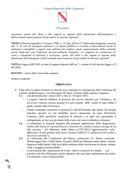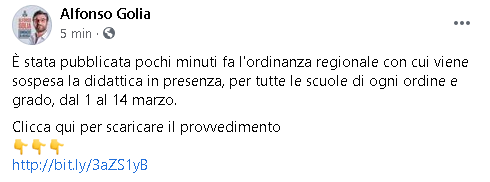 "È stata pubblicata pochi minuti fa l'ordinanza regionale con cui viene sospesa la didattica in presenza, per tutte le scuole di ogni ordine e grado, dal 1 al 14 marzo. Clicca qui per scaricare il provvedimento http://bit.ly/3aZS1yB".