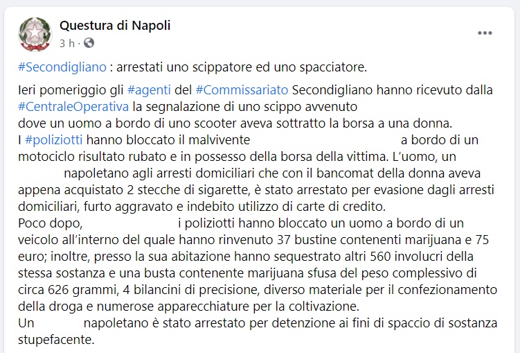 Questo quanto pubblicato sulla pagina facebook della Questura di Napoli: "Secondigliano: arrestati uno scippatore ed uno spacciatore. Ieri pomeriggio gli agenti del Commissariato Secondigliano - si legge nella nota - hanno ricevuto dalla Centrale Operativa la segnalazione di uno scippo avvenuto ... dove un uomo a bordo di uno scooter aveva sottratto la borsa a una donna. I poliziotti hanno bloccato il malvivente ... a bordo di un motociclo risultato rubato e in possesso della borsa della vittima. L’uomo - si legge nella nota -, un ... napoletano agli arresti domiciliari che con il bancomat della donna aveva appena acquistato 2 stecche di sigarette, è stato arrestato per evasione dagli arresti domiciliari - si legge nella nota -, furto aggravato e indebito utilizzo di carte di credito. Poco dopo, ... i poliziotti hanno bloccato un uomo a bordo di un veicolo all’interno del quale hanno rinvenuto 37 bustine contenenti marijuana e 75 euro; inoltre, presso la sua abitazione hanno sequestrato altri 560 involucri della stessa sostanza - si legge nella nota - e una busta contenente marijuana sfusa del peso complessivo di circa 626 grammi, 4 bilancini di precisione, diverso materiale per il confezionamento della droga e numerose apparecchiature per la coltivazione. Un ... napoletano - si legge nella nota - è stato arrestato per detenzione ai fini di spaccio di sostanza stupefacente."