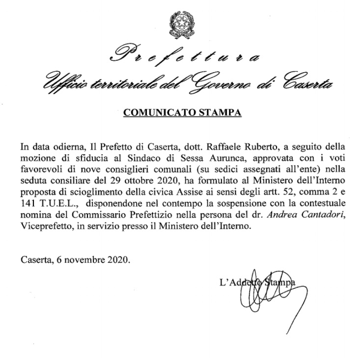Questa la nota stampa della Prefettura di Caserta: