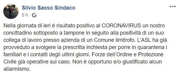 Questo quanto pubblicato sulla pagina facebook del Sindaco Sasso: