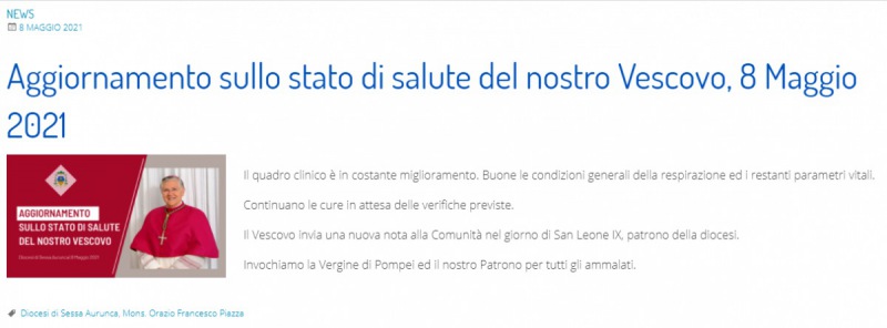 Ancora buone notizie sulle condizioni di Sua Eminenza Orazio Francesco Piazza: questo l'aggiornamento sullo stato di salute del Vescovo di Sessa Aurunca pubblicato sul sito web della Diocesi: "Il quadro clinico è in costante miglioramento. Buone le condizioni generali della respirazione ed i restanti parametri vitali. Continuano le cure - si legge nella nota - in attesa delle verifiche previste. Il Vescovo invia una nuova nota alla Comunità nel giorno di San Leone IX, patrono della diocesi. Invochiamo la Vergine di Pompei - continua la nota - ed il nostro Patrono per tutti gli ammalati".