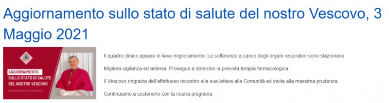 Questo l'aggiornamento sullo stato di salute del Vescovo pubblicato da poco sul sito web della Diocesi di Sessa Aurunca: "Il quadro clinico appare in lieve miglioramento. Le sofferenze a carico degli organi respiratori sono stazionarie. Migliora vigilanza ed astenia. Prosegue a domicilio la prevista terapia farmacologica. Il Vescovo - si legge nella nota - ringrazia dell’affettuoso riscontro alla sua lettera alla Comunità ed invita alla massima prudenza. Continuiamo a sostenerlo con la nostra preghiera".