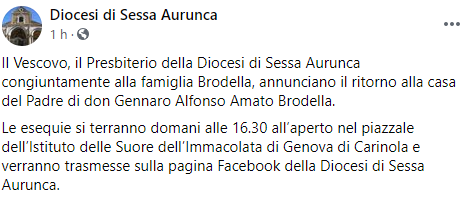 Questo il post pubblicato sulla pagina Facebook 'Diocesi di Sessa Aurnca': "ll Vescovo, il Presbiterio della Diocesi di Sessa Aurunca congiuntamente alla famiglia Brodella, annunciano il ritorno alla casa del Padre di don Gennaro Alfonso Amato Brodella.