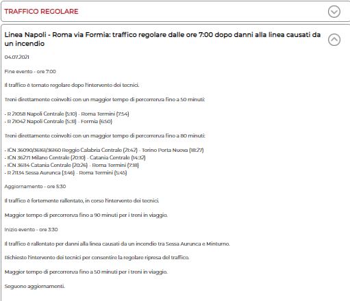 Lo apprendiamo dal sito web di Trenitalia: "Inizio evento - ore 3:30. Il traffico è rallentato per danni alla linea causati da un incendio tra Sessa Aurunca e Minturno. Richiesto l'intervento dei tecnici per consentire la regolare ripresa del traffico. Maggior tempo di percorrenza - si legge - fino a 50 minuti per i treni in viaggio. Seguono aggiornamenti. Aggiornamento - ore 5:30. Il traffico è fortemente rallentato, in corso l'intervento dei tecnici. Maggior tempo di percorrenza fino a 90 minuti per i treni in viaggio. (...) Fine evento - ore 7:00 Il traffico è tornato regolare dopo l'intervento dei tecnici (...)".