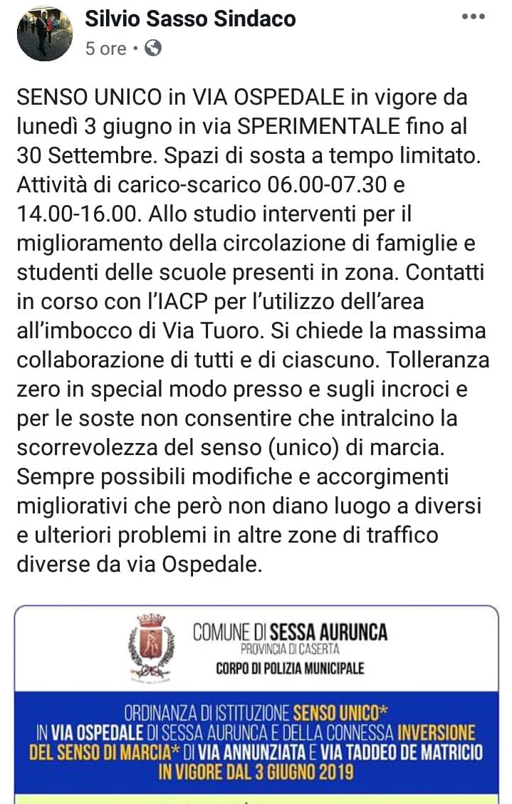 Questo quanto apprendiamo direttamente dal Sindaco di Sessa Aurunca Silvio Sasso in merito alla viabilità cittadina.