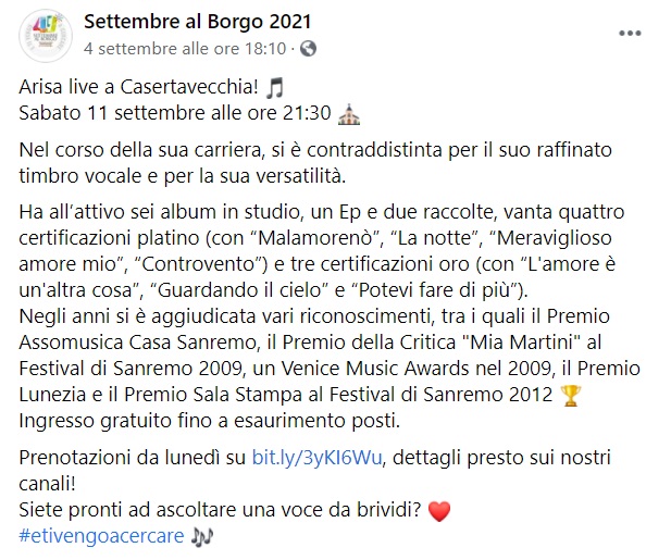 Questa la nota apparsa su facebook del Festival Settembre al Borgo 2021: