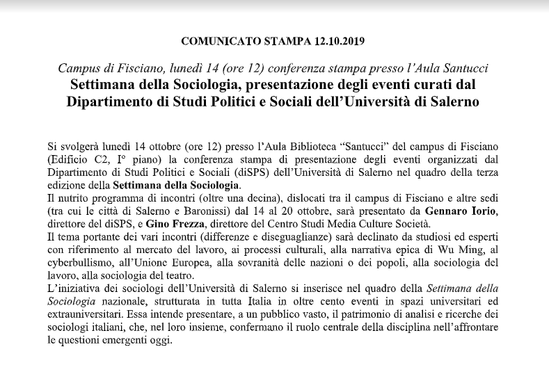 Di seguito, il testo del comunicato sulla 'Settimana della Sociologia', giunto in redazione.