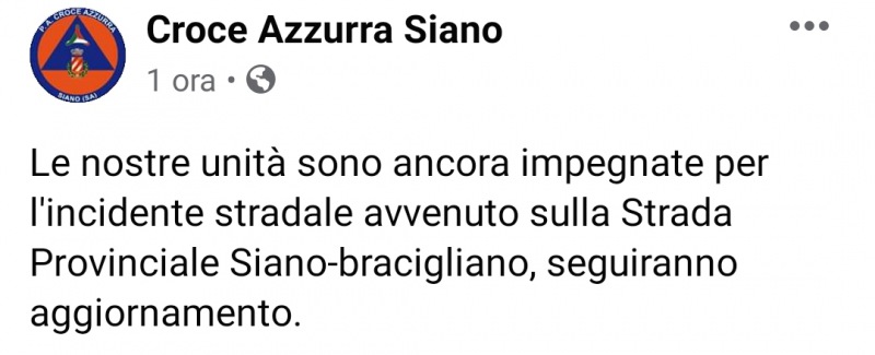 "Le nostre unità sono ancora impegnate per l'incidente stradale avvenuto sulla Strada Provinciale Siano-bracigliano, seguiranno aggiornamenti."