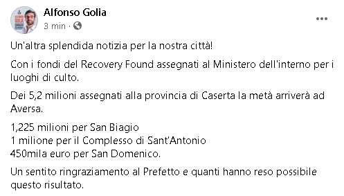 "Un'altra splendida notizia per la nostra città! Con i fondi del Recovery Found assegnati al Ministero dell'interno per i luoghi di culto. Dei 5,2 milioni assegnati alla provincia di Caserta la metà arriverà ad Aversa. 1,225 milioni per San Biagio 1 milione per il Complesso di Sant'Antonio 450mila euro per San Domenico. Un sentito ringraziamento al Prefetto e quanti hanno reso possibile questo risultato."