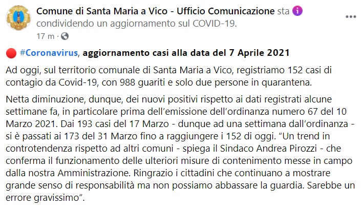 "#Coronavirus, aggiornamento casi alla data del 7 aprile 2021. Ad oggi, sul territorio comunale di Santa Maria a Vico, registriamo 152 casi di contagio da Covid-19, con 988 guariti e solo due persone in quarantena. Netta diminuzione, dunque, dei nuovi positivi rispetto- si legge nella nota- ai dati registrati alcune settimane fa, in particolare prima dell’emissione dell’ordinanza numero 67 del 10 Marzo 2021. Dai 193 casi del 17 Marzo - dunque ad una settimana dall’ordinanza - si è passati ai 173 del 31 Marzo fino a raggiungere i 152 di oggi. “Un trend in controtendenza rispetto ad altri comuni - spiega il Sindaco Andrea Pirozzi - che conferma il funzionamento delle ulteriori misure di contenimento messe in campo dalla nostra Amministrazione. Ringrazio- si legge nella nota- i cittadini che continuano a mostrare grande senso di responsabilità ma non possiamo abbassare la guardia. Sarebbe un errore gravissimo”."