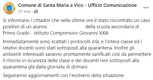 "Si informano i cittadini che nelle ultime ore è stato riscontrato un caso positivo di un alunno ... della scuola secondaria di Primo Grado - Istituto Comprensivo Giovanni XXIII Immediatamente sono scattati i protocolli ASL e l’intera classe ed i relativi docenti sono stati sottoposti- si legge nella nota- alla quarantena. Inoltre gli ambienti interessati saranno prontamente sanificati così da permettere il ritorno in sicurezza delle classi e dei docenti non sottoposti alla quarantena già dalla giornata di domani. Seguiranno aggiornamenti con l’evolversi della situazione"
