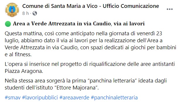 "Questa mattina, così come anticipato nella giornata di venerdì 23 luglio, abbiamo dato il via ai lavori per la realizzazione dell’Area a Verde Attrezzata in via Caudio, con spazi dedicati ai giochi per bambini e al fitness. -Si legge nella nota- L’opera si inserisce nel progetto di riqualificazione delle aree antistanti Piazza Aragona. Nella stessa area sorgerà la prima “panchina letteraria” ideata dagli studenti dell’istituto “Ettore Majorana”."