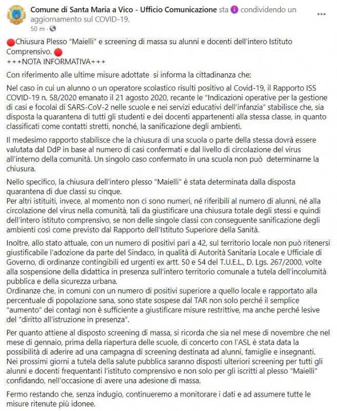 "Con riferimento alle ultime misure adottate si informa la cittadinanza che: Nel caso in cui un alunno o un operatore scolastico risulti positivo al Covid-19, il Rapporto ISS COVID-19 n. 58/2020 emanato il 21 agosto 2020, recante le “Indicazioni operative per la gestione di casi e focolai di SARS-CoV-2 nelle scuole e nei servizi educativi dell’infanzia” stabilisce che, sia disposta la quarantena di tutti gli studenti e dei docenti appartenenti alla stessa classe, in quanto classificati come contatti stretti, nonché, la sanificazione degli ambienti. -Si legge nella nota- Il medesimo rapporto stabilisce che la chiusura di una scuola o parte della stessa dovrà essere valutata dal DdP in base al numero di casi confermati e dal livello di circolazione del virus all’interno della comunità. Un singolo caso confermato in una scuola non può determinarne la chiusura. Nello specifico, la chiusura dell’intero plesso “Maielli” è stata determinata dalla disposta quarantena di due classi su cinque. -Si legge nella nota- Per altri istituiti, invece, al momento non ci sono numeri, né riferibili al numero di alunni, né alla circolazione del virus nella comunità, tali da giustificare una chiusura totale degli stessi e quindi dell’intero istituto comprensivo, se non delle singole classi con conseguente sanificazione degli ambienti così come previsto dal Rapporto dell’Istituto Superiore della Sanità. Inoltre, allo stato attuale, con un numero di positivi pari a 42, sul territorio locale non può ritenersi giustificabile l’adozione da parte del Sindaco, in qualità di Autorità Sanitaria Locale e Ufficiale di Governo, di ordinanze contingibili ed urgenti ex artt. 50 e 54 del T.U.E.L., D. Lgs. 267/2000, volte alla sospensione della didattica in presenza sull’intero territorio comunale a tutela dell’incolumità pubblica e della sicurezza urbana. Ordinanze che, in comuni con un numero di positivi superiore a quello locale e rapportato alla percentuale di popolazione sana, sono state sospese dal TAR non solo perché il semplice “aumento” dei contagi non è sufficiente a giustificare misure restrittive, ma anche perché lesive del “diritto all’istruzione in presenza”. -Si legge nella nota- Per quanto attiene al disposto screening di massa, si ricorda che sia nel mese di novembre che nel mese di gennaio, prima della riapertura delle scuole, di concerto con l’ASL è stata data la possibilità di aderire ad una campagna di screening destinata ad alunni, famiglie e insegnanti. Nei prossimi giorni a tutela della salute pubblica saranno disposti ulteriori screening per tutti gli alunni e docenti frequentanti l’istituto comprensivo e non solo per gli iscritti al plesso “Maielli” confidando, nell’occasione di avere una adesione di massa. Fermo restando che, senza indugio, continueremo a monitorare i dati e ad assumere tutte le misure ritenute più idonee."