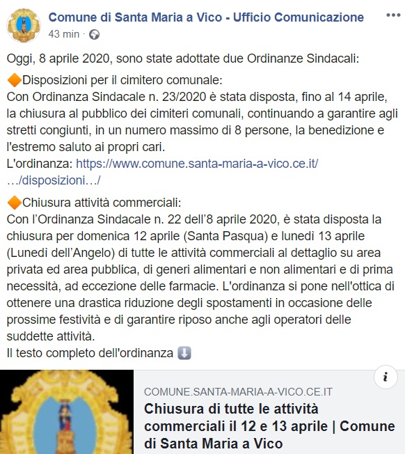 Questo quanto apprendiamo dalla pagina facebook del Comune di SMAV:
