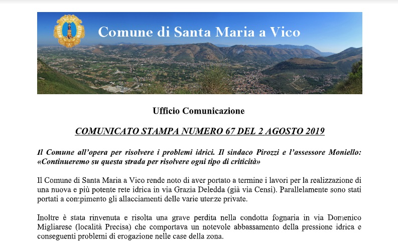 Questo il comunicato inviatoci dall'Ufficio Stampa del Comune di Santa Maria a Vico.