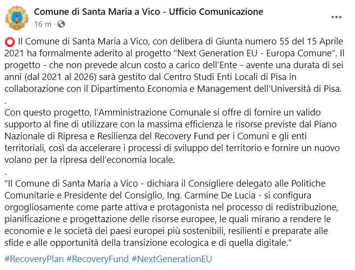 'Il Comune di Santa Maria a Vico, con delibera di Giunta numero 55 del 15 Aprile 2021 ha formalmente aderito al progetto "Next Generation EU - Europa Comune”. Il progetto - che non prevede alcun costo a carico dell’Ente - avente una durata di sei anni (dal 2021 al 2026) sarà gestito dal Centro Studi Enti Locali di Pisa in collaborazione- si legge nella nota- con il Dipartimento Economia e Management dell'Università di Pisa. . Con questo progetto, l’Amministrazione Comunale si offre di fornire un valido supporto al fine di utilizzare con la massima efficienza le risorse previste dal Piano Nazionale di Ripresa e Resilienza del Recovery Fund per i Comuni e gli enti territoriali, così da accelerare i processi di sviluppo del territorio e fornire un nuovo volano per la ripresa dell’economia locale. . "Il Comune di Santa Maria a Vico - dichiara il Consigliere delegato alle Politiche Comunitarie e Presidente del Consiglio, Ing. Carmine De Lucia - si configura orgogliosamente come parte attiva e protagonista nel processo di redistribuzione, pianificazione e progettazione delle risorse europee, le quali mirano- si legge nella nota- a rendere le economie e le società dei paesi europei più sostenibili, resilienti e preparate alle sfide e alle opportunità della transizione ecologica e di quella digitale."'