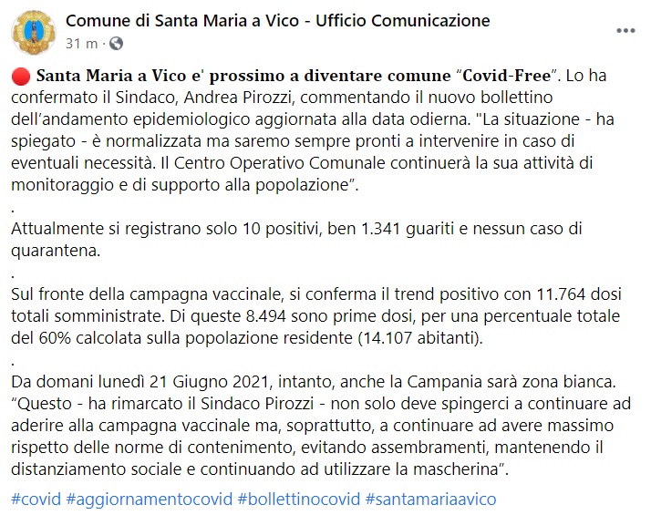 "Santa Maria a Vico è prossimo a diventare comune "Covid Free". Lo ha confermato il Sindaco, Andrea Pirozzi, commentando il nuovo bollettino dell’andamento epidemiologico aggiornata alla data odierna. "La situazione - ha spiegato - è normalizzata ma- si legge nella nota- saremo sempre pronti a intervenire in caso di eventuali necessità. Il Centro Operativo Comunale continuerà la sua attività di monitoraggio e di supporto alla popolazione”. . Attualmente si registrano solo 10 positivi, ben 1.341 guariti e nessun caso di quarantena. . Sul fronte della campagna vaccinale, si conferma il trend positivo con 11.764 dosi totali somministrate. Di queste 8.494 sono prime dosi, per una percentuale totale del 60% calcolata- si legge nella nota- sulla popolazione residente (14.107 abitanti). . Da domani lunedì 21 Giugno 2021, intanto, anche la Campania sarà zona bianca. “Questo - ha rimarcato il Sindaco Pirozzi - non solo deve spingerci a continuare ad aderire alla campagna vaccinale ma, soprattutto, a continuare ad avere massimo rispetto delle norme di contenimento, evitando assembramenti, mantenendo il distanziamento sociale e continuando ad utilizzare la mascherina”."