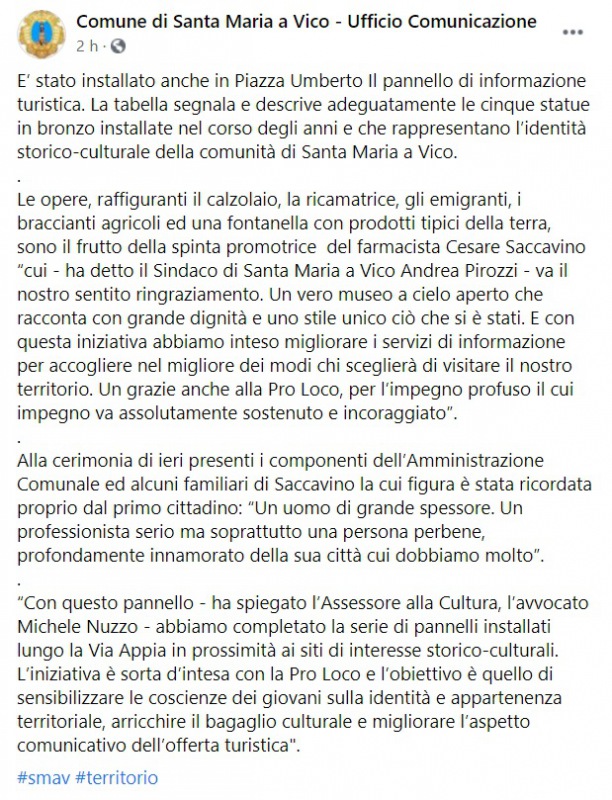 "E’ stato installato anche in Piazza Umberto Il pannello di informazione turistica. La tabella segnala e descrive adeguatamente le cinque statue in bronzo installate nel corso degli anni e che rappresentano l’identità storico-culturale della comunità di Santa Maria a Vico. . Le opere, raffiguranti il calzolaio, la ricamatrice, gli emigranti, i braccianti agricoli ed una fontanella con prodotti tipici della terra, sono il frutto della spinta promotrice del farmacista Cesare Saccavino “cui - ha detto il Sindaco di Santa Maria a Vico Andrea Pirozzi - va il nostro sentito ringraziamento. -Si legge nella nota- Un vero museo a cielo aperto che racconta con grande dignità e uno stile unico ciò che si è stati. E con questa iniziativa abbiamo inteso migliorare i servizi di informazione per accogliere nel migliore dei modi chi sceglierà di visitare il nostro territorio. Un grazie anche alla Pro Loco, per l’impegno profuso il cui impegno va assolutamente sostenuto e incoraggiato”. . Alla cerimonia di ieri presenti i componenti dell’Amministrazione Comunale ed alcuni familiari di Saccavino la cui figura è stata ricordata proprio dal primo cittadino: “Un uomo di grande spessore. Un professionista serio ma soprattutto una persona perbene, profondamente innamorato della sua città cui dobbiamo molto”. . -Si legge nella nota- “Con questo pannello - ha spiegato l’Assessore alla Cultura, l’avvocato Michele Nuzzo - abbiamo completato la serie di pannelli installati lungo la Via Appia in prossimità ai siti di interesse storico-culturali. L’iniziativa è sorta d’intesa con la Pro Loco e l’obiettivo è quello di sensibilizzare le coscienze dei giovani sulla identità e appartenenza territoriale, arricchire il bagaglio culturale e migliorare l’aspetto comunicativo dell’offerta turistica"."