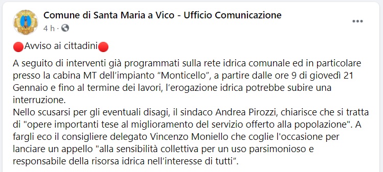 Questo quanto apprendiamo dalla pagina fb del Comune di SMAV: "Avviso ai cittadini A seguito di interventi già programmati sulla rete idrica comunale ed in particolare presso la cabina MT dell’impianto “Monticello” - si legge nella nota -, a partire dalle ore 9 di giovedì 21 Gennaio e fino al termine dei lavori, l’erogazione idrica potrebbe subire una interruzione. Nello scusarsi per gli eventuali disagi, il sindaco Andrea Pirozzi - si legge nella nota -, chiarisce che si tratta di "opere importanti tese al miglioramento del servizio offerto alla popolazione". A fargli eco il consigliere delegato Vincenzo Moniello che coglie l'occasione - si legge nella nota - per lanciare un appello "alla sensibilità collettiva per un uso parsimonioso e responsabile della risorsa idrica nell’interesse di tutti”."