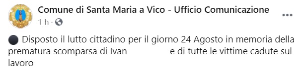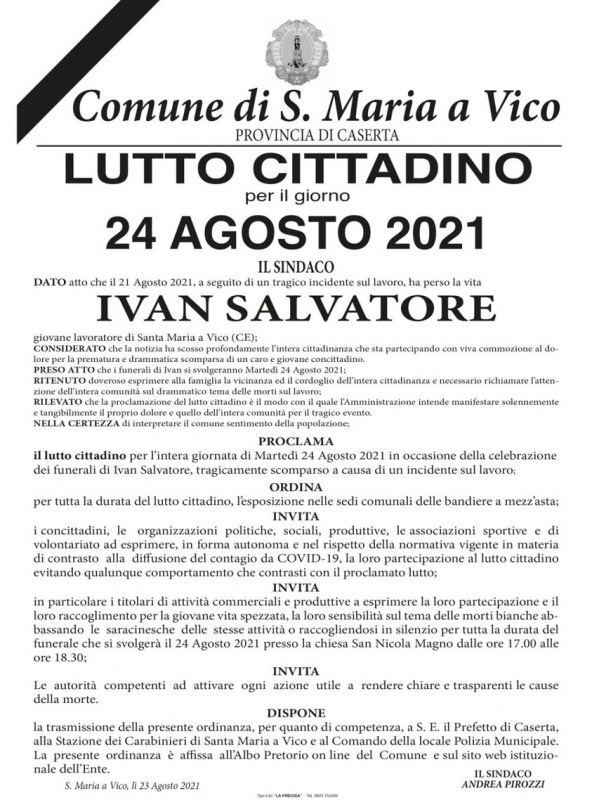 "Disposto il lutto cittadino per il giorno 24 Agosto in memoria della prematura scomparsa di Ivan ... e di tutte le vittime cadute sul lavoro"