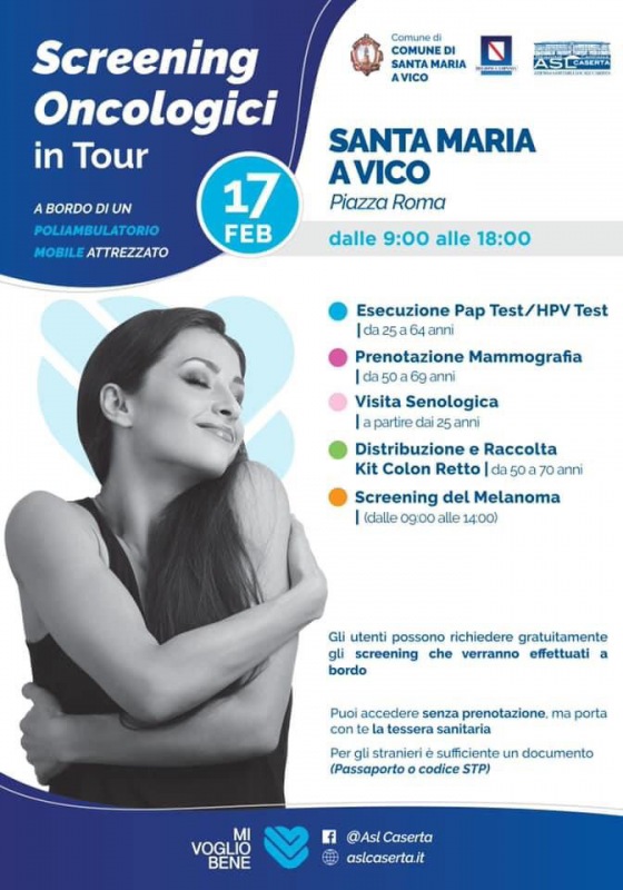 "Ancora una volta invitiamo tutta la cittadinanza a partecipare all’iniziativa “SCREENING ONCOLOGICI IN TOUR” organizzata dal Comune in collaborazione con l’Asl Caserta. La prossima tappa è prevista Giovedì 17 Febbraio presso Piazza Roma dalle 9.00 alle ore 18.00 con l’ausilio di un poliambulatorio mobile attrezzato. -Si legge nella nota- Nell’occasione, sarà possibile usufruire gratuitamente dei seguenti servizi: Pap Test / HPV Test; Prenotazioni Mammografie; Visita Senologica; Distribuzione e Raccolta Kit Colon Retto; Screening del Melanoma. "Tutta l'Amministrazione è particolarmente sensibile al tema della prevenzione, specialmente in questi ultimi due anni in cui è stato difficile prenotare anche visite ordinarie. Per noi è essenziale ricominciare dando spazio soprattutto alla prevenzione"- hanno dichiarato in merito il Sindaco Andrea Pirozzi e l’Assessore alle Politiche Sociali Veronica Biondo. -Si legge nella nota- icordiamo che tutti possono usufruire dei servizi senza alcuna prenotazione. Non dimenticare la tessere sanitaria. Invitiamo alla massima partecipazione e ricordiamo a tutti i cittadini che la prevenzione è la prima strada verso la salute."