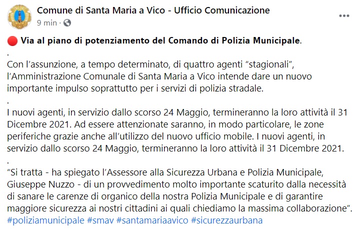 "Con l’assunzione, a tempo determinato, di quattro agenti “stagionali”, l’Amministrazione Comunale di Santa Maria a Vico intende dare un nuovo importante impulso soprattutto per i servizi di polizia stradale. -Si legge nella nota- I nuovi agenti, in servizio dallo scorso 24 Maggio, termineranno la loro attività il 31 Dicembre 2021. Ad essere attenzionate saranno, in modo particolare, le zone periferiche grazie anche all’utilizzo del nuovo ufficio mobile. I nuovi agenti, in servizio dallo scorso 24 Maggio, termineranno la loro attività il 31 Dicembre 2021. -Si legge nella nota- “Si tratta - ha spiegato l’Assessore alla Sicurezza Urbana e Polizia Municipale, Giuseppe Nuzzo - di un provvedimento molto importante scaturito dalla necessità di sanare le carenze di organico della nostra Polizia Municipale e di garantire maggiore sicurezza ai nostri cittadini ai quali chiediamo la massima collaborazione”."