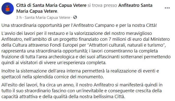 Questo quanto pubblicato sulla pagina fb del Comune di SMCV: "Una straordinaria opportunità per l’Anfiteatro Campano e per la nostra Città! L’avvio dei lavori per il restauro e la valorizzazione del nostro meraviglioso Anfiteatro - si legge nella nota -, nell’ambito di un progetto finanziato con 7 milioni di euro dal Ministero della Cultura attraverso Fondi Europei per “Attrattori culturali, naturali e turismo”, rappresenta una straordinaria opportunità; i lavori consentiranno la completa fruizione di tutta l’area archeologica e dei suoi affascinanti sotterranei permettendo quindi ai visitatori di vivere un’esperienza completa. Inoltre la sistemazione dell’area interna permetterà la realizzazione di eventi e spettacoli nella splendida cornice del monumento. All’esito dei lavori, fra circa un anno, il nostro Anfiteatro - si legge nella nota -si manifesterà quindi in tutto il suo straordinario fascino con un’inevitabile e conseguente crescita della capacità attrattiva e della qualità della nostra bellissima Città."
