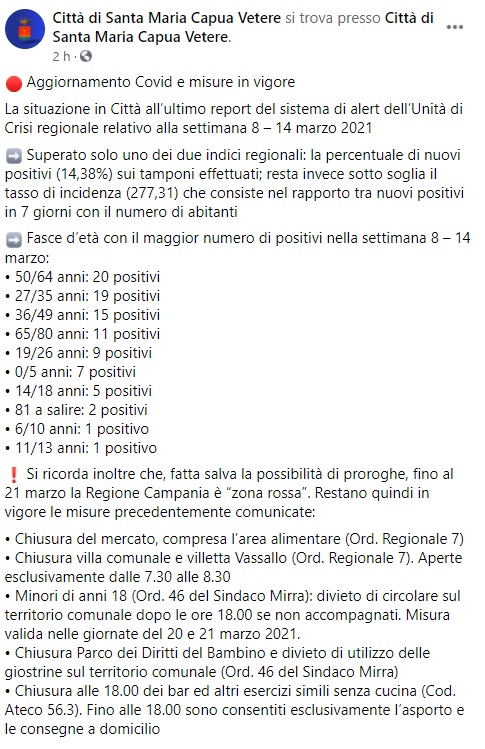 "Aggiornamento Covid e misure in vigore. La situazione in Città all’ultimo report del sistema di alert dell’Unità di Crisi regionale relativo alla settimana 8 – 14 marzo 2021. Superato solo uno dei due indici regionali: la percentuale di nuovi positivi (14,38%) sui tamponi effettuati; resta invece- si legge nella nota- sotto soglia il tasso di incidenza (277,31) che consiste nel rapporto tra nuovi positivi in 7 giorni con il numero di abitanti. Fasce d’età con il maggior numero di positivi nella settimana 8 – 14 marzo: • 50/64 anni: 20 positivi • 27/35 anni: 19 positivi • 36/49 anni: 15 positivi • 65/80 anni: 11 positivi • 19/26 anni: 9 positivi • 0/5 anni: 7 positivi • 14/18 anni: 5 positivi • 81 a salire: 2 positivi • 6/10 anni: 1 positivo • 11/13 anni: 1 positivo Si ricorda inoltre che, fatta salva la possibilità di proroghe, fino al 21 marzo la Regione Campania è “zona rossa”. Restano quindi in vigore le misure precedentemente comunicate: • Chiusura del mercato, compresa l’area alimentare (Ord. Regionale 7) • Chiusura villa comunale e villetta Vassallo (Ord. Regionale 7). Aperte esclusivamente dalle 7.30 alle 8.30 • Minori di anni 18 (Ord. 46 del Sindaco Mirra): divieto di circolare sul territorio comunale dopo le ore 18.00 se non accompagnati. Misura valida nelle giornate del 20 e 21 marzo 2021. • Chiusura Parco dei Diritti del Bambino e divieto di utilizzo delle giostrine sul territorio comunale (Ord. 46 del Sindaco Mirra) • Chiusura alle 18.00 dei bar ed altri esercizi simili senza cucina (Cod. Ateco 56.3). Fino alle 18.00- si legge nella nota- sono consentiti esclusivamente l’asporto e le consegne a domicilio"