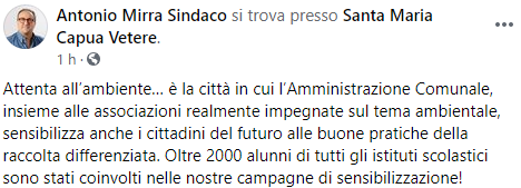 Questo il post pubblicato sulla sua pagina Facebook dal Sindaco di Santa Maria Capua Vetere Antonio Mirra: "Attenta all’ambiente… è la città in cui l’Amministrazione Comunale, insieme alle associazioni realmente impegnate - si legge nel post - sul tema ambientale, sensibilizza anche i cittadini del futuro alle buone pratiche della raccolta differenziata. Oltre 2000 alunni di tutti gli istituti scolastici sono stati coinvolti nelle nostre campagne di sensibilizzazione"!