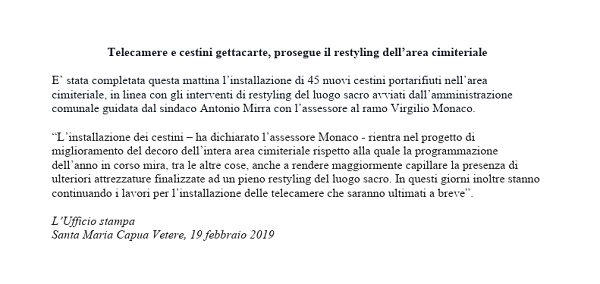 Questo il comunicato inviatoci dall'Ufficio stampa del Comune di Santa Maria Capua Vetere.