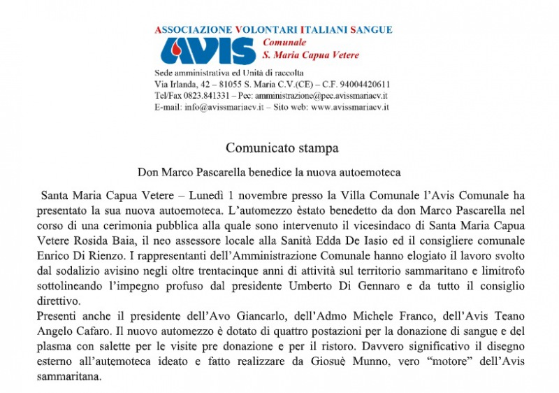 "Don Marco Pascarella benedice la nuova autoemoteca. Lunedì 1 novembre presso la Villa Comunale l’Avis Comunale ha presentato la sua nuova autoemoteca. L’automezzo è stato benedetto- si legge nella nota- da don Marco Pascarella nel corso di una cerimonia pubblica alla quale sono intervenuto il vicesindaco di Santa Maria Capua Vetere Rosida Baia, il neo assessore locale alla Sanità Edda De Iasio ed il consigliere comunale Enrico Di Rienzo. I rappresentanti dell’Amministrazione Comunale hanno elogiato il lavoro svolto dal sodalizio avisino negli oltre trentacinque anni di attività sul territorio sammaritano e limitrofo sottolineando l’impegno profuso dal presidente Umberto Di Gennaro e da tutto il consiglio direttivo. Presenti anche il presidente dell’Avo Giancarlo, dell’Admo Michele Franco, dell’Avis Teano Angelo Cafaro. Il nuovo automezzo è dotato di quattro postazioni per la donazione di sangue e del plasma con salette per le visite pre donazione e per il ristoro. Davvero significativo- si legge nella nota- il disegno esterno all’autemoteca ideato e fatto realizzare da Giosuè Munno, vero “motore” dell’Avis sammaritana."