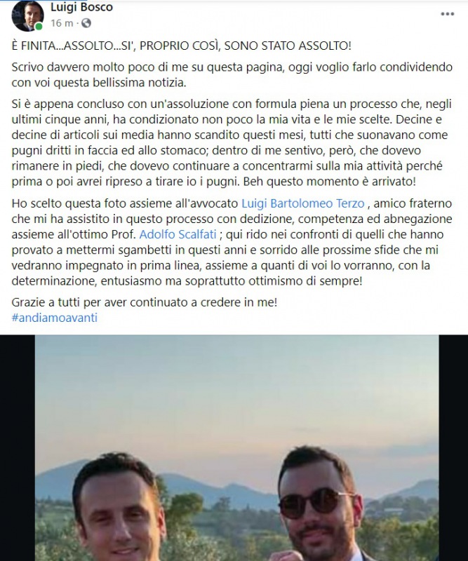 "È FINITA...ASSOLTO...SI', PROPRIO COSÌ, SONO STATO ASSOLTO! Scrivo davvero molto poco di me su questa pagina, oggi voglio farlo condividendo con voi questa bellissima notizia. Si è appena concluso con un'assoluzione con formula piena un processo che, negli ultimi cinque anni, ha condizionato non poco- si legge nella nota- la mia vita e le mie scelte. Decine e decine di articoli sui media hanno scandito questi mesi, tutti che suonavano come pugni dritti in faccia ed allo stomaco; dentro di me sentivo, però, che dovevo rimanere in piedi, che dovevo continuare a concentrarmi sulla mia attività perché prima o poi avrei ripreso a tirare io i pugni. Beh questo momento è arrivato! Ho scelto questa foto assieme all'avvocato Luigi Bartolomeo Terzo , amico fraterno che mi ha assistito in questo processo con dedizione, competenza ed abnegazione assieme all'ottimo Prof. Adolfo Scalfati ; qui rido nei confronti di quelli che hanno provato a mettermi sgambetti in questi anni e sorrido- si legge nella nota- alle prossime sfide che mi vedranno impegnato in prima linea, assieme a quanti di voi lo vorranno, con la determinazione, entusiasmo ma soprattutto ottimismo di sempre! Grazie a tutti per aver continuato a credere in me!"