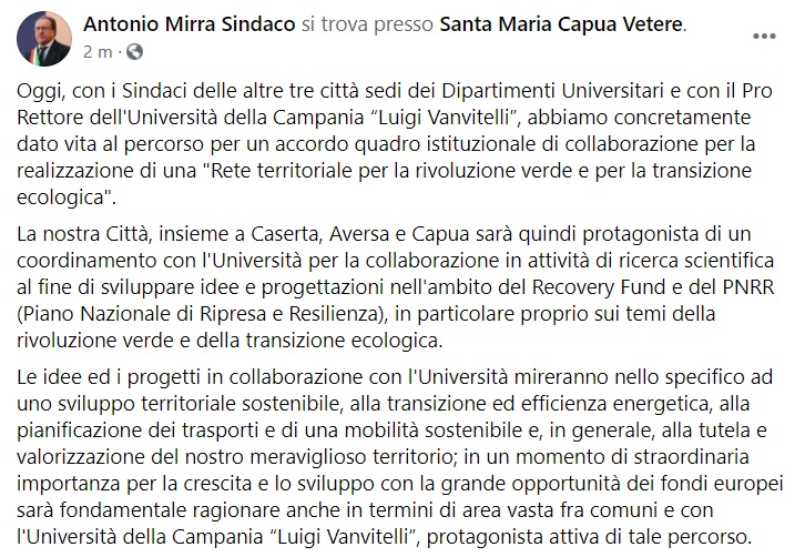 "Oggi, con i Sindaci delle altre tre città sedi dei Dipartimenti Universitari e con il Pro Rettore dell'Università della Campania “Luigi Vanvitelli”, abbiamo concretamente dato vita al percorso per un accordo quadro istituzionale di collaborazione per la realizzazione di una "Rete territoriale per la rivoluzione verde e per la transizione ecologica". -Si legge nella nota- La nostra Città, insieme a Caserta, Aversa e Capua sarà quindi protagonista di un coordinamento con l'Università per la collaborazione in attività di ricerca scientifica al fine di sviluppare idee e progettazioni nell'ambito del Recovery Fund e del PNRR (Piano Nazionale di Ripresa e Resilienza), in particolare proprio sui temi della rivoluzione verde e della transizione ecologica. Le idee ed i progetti in collaborazione con l'Università mireranno nello specifico ad uno sviluppo territoriale sostenibile, alla transizione ed efficienza energetica, alla pianificazione dei trasporti e di una mobilità sostenibile e, -si legge nella nota- in generale, alla tutela e valorizzazione del nostro meraviglioso territorio; in un momento di straordinaria importanza per la crescita e lo sviluppo con la grande opportunità dei fondi europei sarà fondamentale ragionare anche in termini di area vasta fra comuni e con l'Università della Campania “Luigi Vanvitelli”, protagonista attiva di tale percorso."