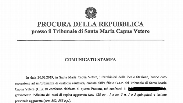 Questo parte del comunicato inviatoci dalla Procura della Repubblica presso il Tribunale di Santa Maria Capua Vetere.