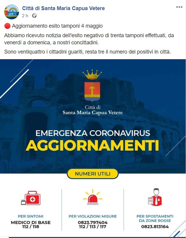 Questo quanto pubblicato sulla pagina facebook del Comune di SMCV: