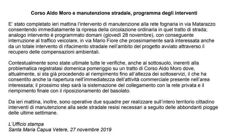Questa la nota stampa del Comune di Santa Maria Capua Vetere: