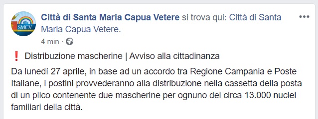 SMCV. Dal 27 aprile distribuzione nelle cassette postali di 2 mascherine per nucleo familiare