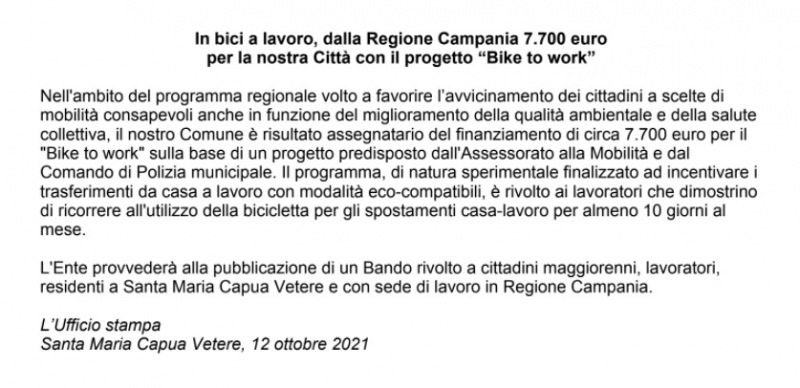 "In bici a lavoro, dalla Regione Campania 7.700 euro per la nostra Città con il progetto “Bike to work”. Nell'ambito del programma regionale volto a favorire l’avvicinamento dei cittadini a scelte di mobilità consapevoli anche in funzione- si legge nella nota- del miglioramento della qualità ambientale e della salute collettiva, il nostro Comune è risultato assegnatario del finanziamento di circa 7.700 euro per il "Bike to work" sulla base di un progetto predisposto dall'Assessorato alla Mobilità e dal Comando di Polizia municipale. Il programma, di natura sperimentale finalizzato ad incentivare i trasferimenti da casa a lavoro con modalità eco-compatibili, è rivolto ai lavoratori che dimostrino di ricorrere all'utilizzo della bicicletta per gli spostamenti casa-lavoro per almeno 10 giorni al mese. L'Ente- si legge nella nota- provvederà alla pubblicazione di un Bando rivolto a cittadini maggiorenni, lavoratori, residenti a Santa Maria Capua Vetere e con sede di lavoro in Regione Campania."