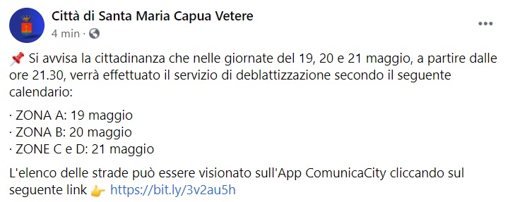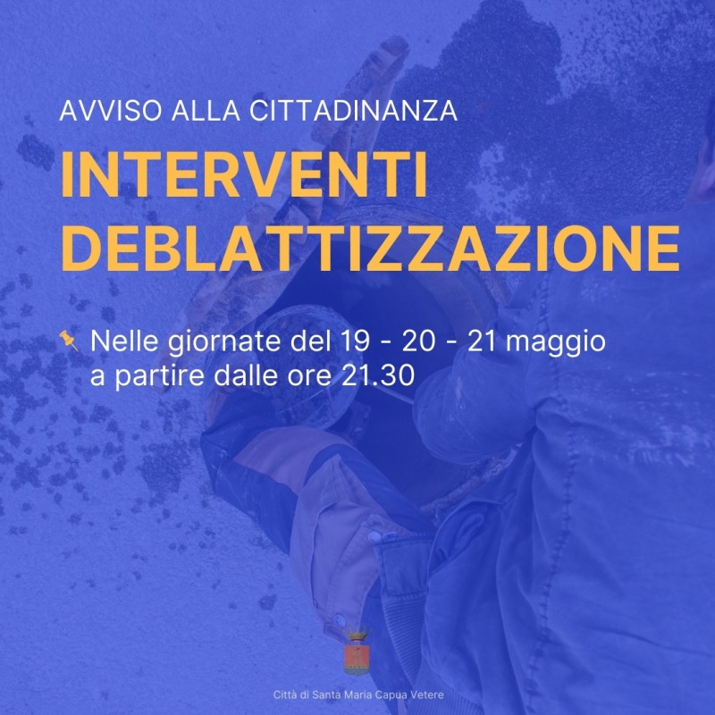 Questo quanto pubblicato sulla pagina fb del Comune di SMCV: "Si avvisa la cittadinanza che nelle giornate del 19, 20 e 21 maggio, a partire dalle ore 21.30, verrà effettuato il servizio di deblattizzazione secondo il seguente calendario: · ZONA A: 19 maggio · ZONA B: 20 maggio · ZONE C e D: 21 maggio L'elenco delle strade può essere visionato sull'App ComunicaCity cliccando sul seguente link".