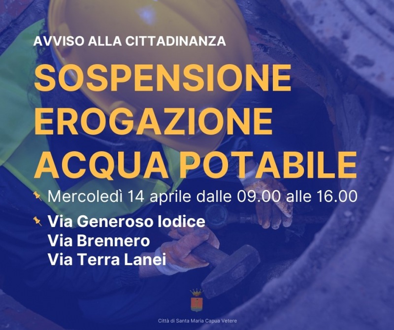 Questo quanto apprendiamo dalla pagna fb del Comune di SMCV: "Si comunica alla cittadinanza che, a causa di lavori sulla condotta idrica principale, nella giornata di mercoledì 14 aprile - si legge nella nota - dalle ore 9.00 alle 16.00 verrà sospesa l'erogazione di acqua potabile nelle seguenti strade: · Via Generoso Iodice · Via Brennero · Via Terra Lanei"