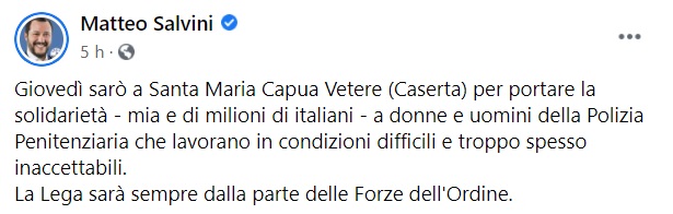 "Giovedì sarò a Santa Maria Capua Vetere (Caserta) per portare la solidarietà - mia e di milioni di italiani - a donne e uomini della Polizia Penitenziaria che lavorano in condizioni difficili e troppo spesso inaccettabili. -Si legge nella nota- La Lega sarà sempre dalla parte delle Forze dell'Ordine."